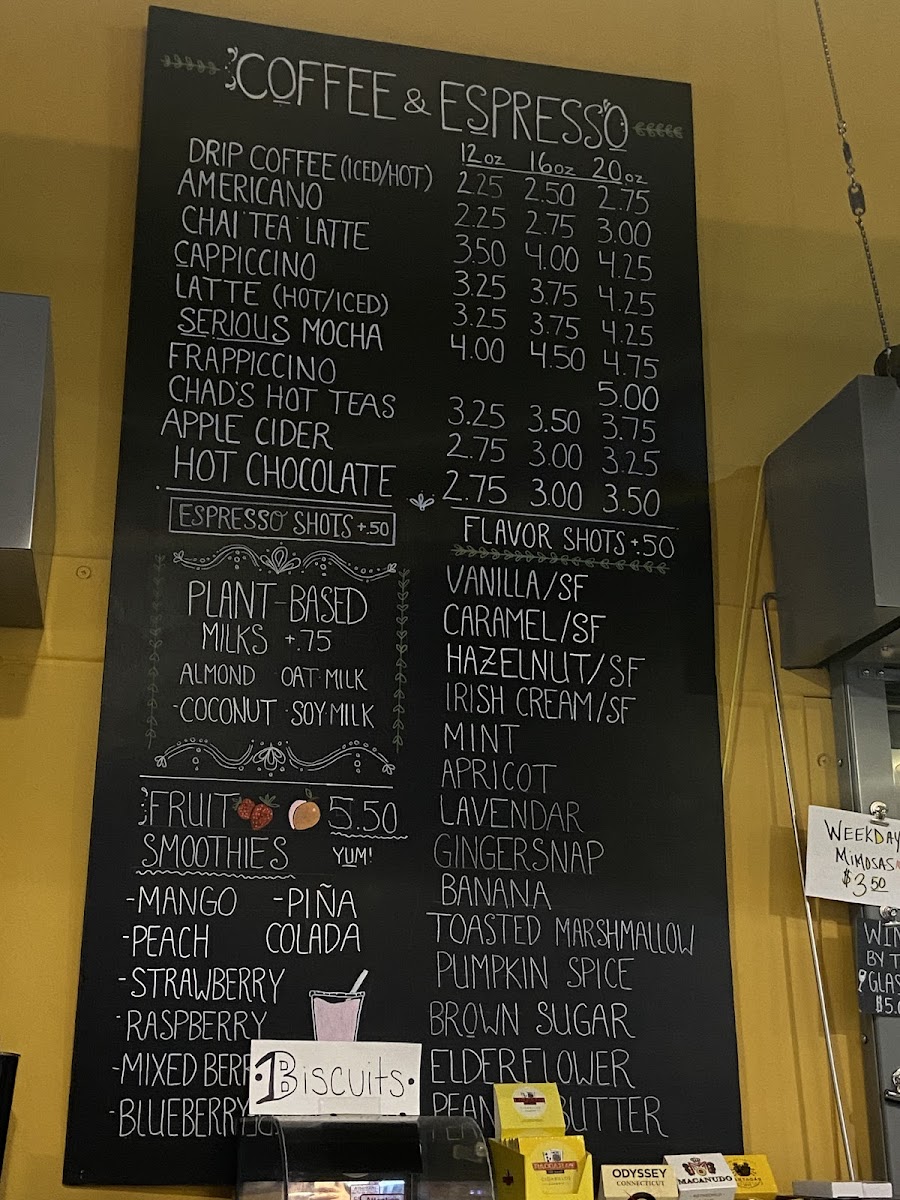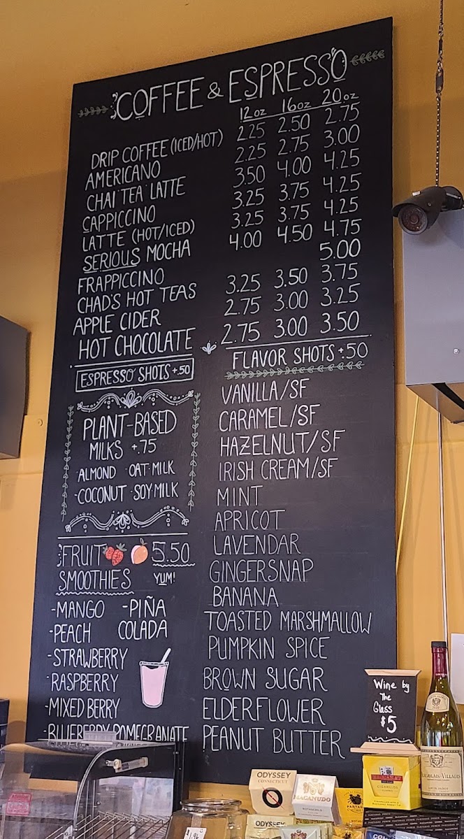 The menu features a mix of hearty sandwiches, such as grilled cheese and house-made pimento cheese, alongside lighter options like veggie wraps. Coffee and espresso drinks provide balance with classic and seasonal choices, including standout options like an iced Irish cream latte or a mixed berry smoothie for a refreshing pick-me-up. Soups and pastries round out the offerings, making it easy to find something for breakfast, lunch, or an afternoon pause.
